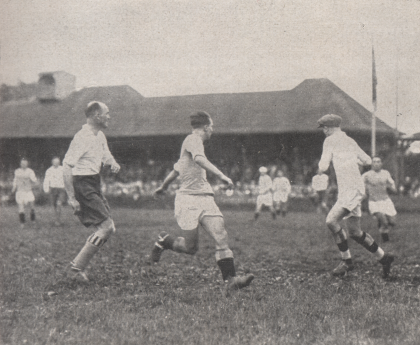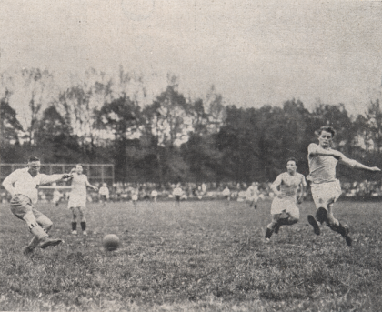 In den letzten Spielminuten waren die Kickers stark zur Verteidigung ihres Vorsprungs gezwungen. Haarer (Kickers) klärt die Lage. Quelle: Kicker Nr. 22 vom 27.05.1930